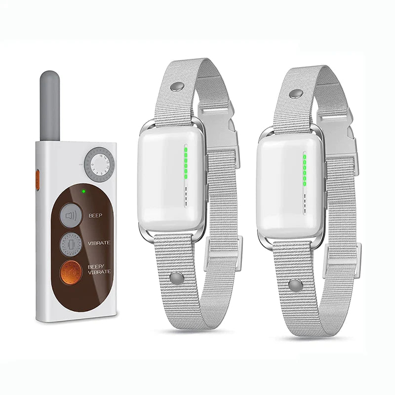 Remote can train 1 or 2 dogs individually (2-dog kit only) with pre-recorded voice command, 16 levels of vibration or static.