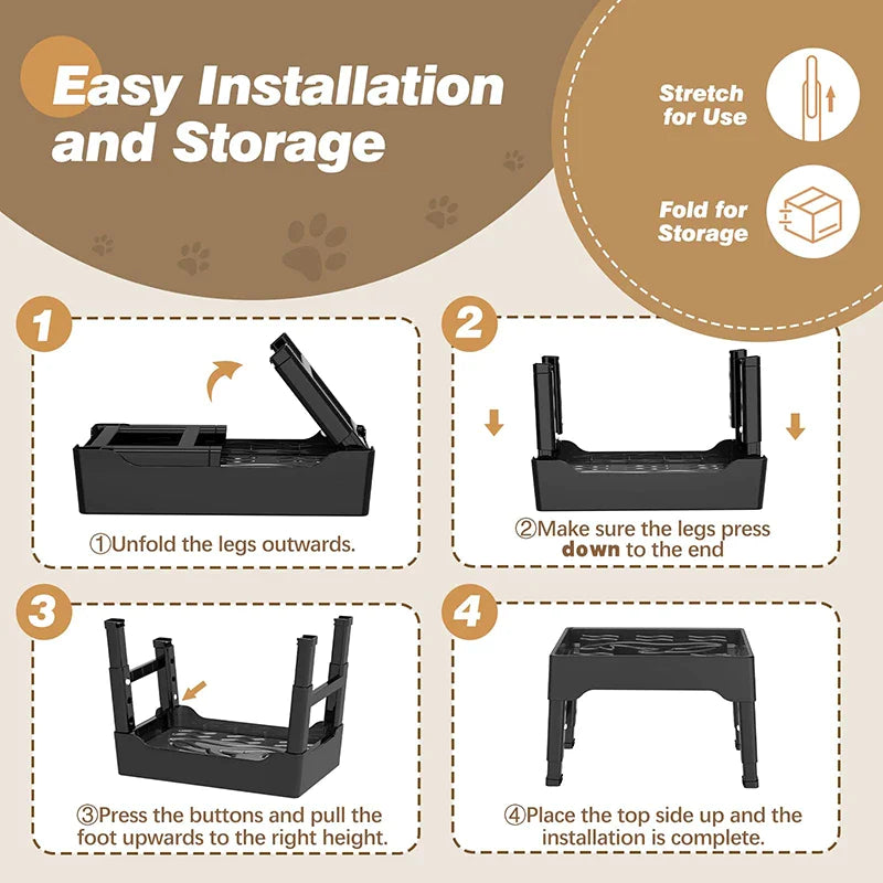 【Easy to Use and Install】This elevated dog bowl for large dogs is super easy to assemble without any tools: ①Unfold the legs outwards ②Make sure the legs press down to the end ③Press the buttons and pull the foot upwards to the right height ④Place the top side up and the installation is complete.
