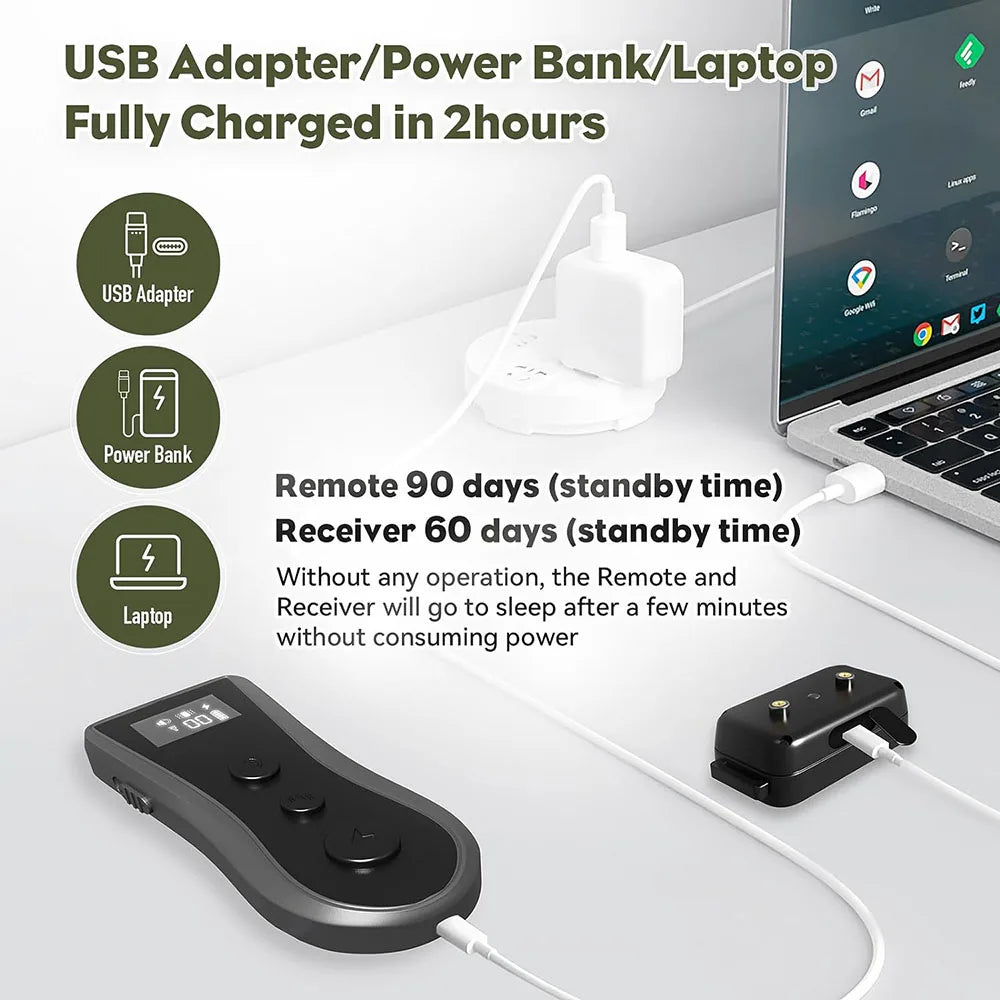 Quick Charge & Long Battery Life: Fully recharge the dog collar within two hours using a phone adapter or USB outlet from your PC, power bank etc. Enjoy up to 90 days of standby time for the remote and 60 days for the collar.