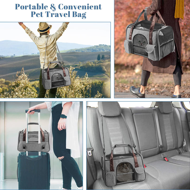 [CONVENIENT DESIGN]: The design of the pet bag is considerable and thoughtful. 1. There are zipper openings on 3 sides, which makes it easier for pets to enter. 2. Thickened detachable cushion at the bottom provides a more comfortable environment for pets. 3. Small bags on the front can place some poop bags, and the elastic mesh bag on the side can put pet snacks or some small pet toys. 4. Slid side to strap onto rolling suitcase handle, making travel easier.