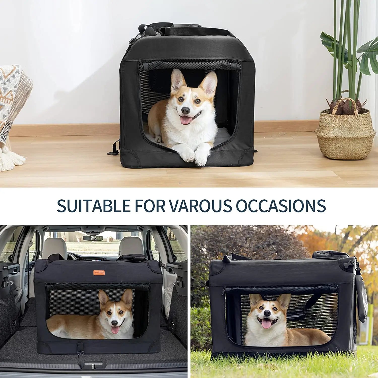 [All-in-one foldable dog cage]: There are anti-collision protection pads on the four corners to protect the pet cage from wear and tear, as well as protect home decoration and car interiors. The breathable mesh on four sides can all be rolled up and opened and fixed, which is convenient for pets to enter and exit freely, as well as interact with their owners.