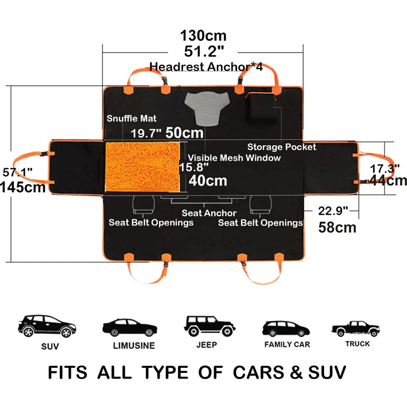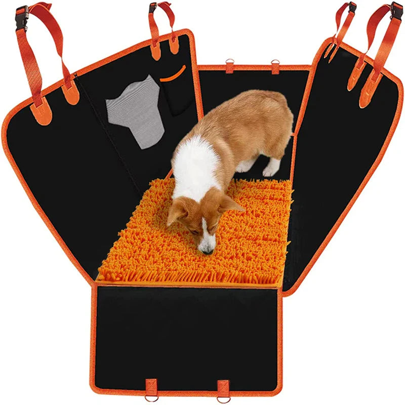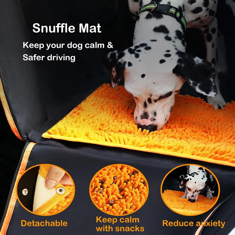 DOG SEAT COVER WITH SNUFFLE MAT. Our seat cover is designed with a detachable snuffle mat. Just give them some snacks to distract them, and you will have a calm and safe journey. You can use our dog seat cover as a cargo liner, a rear seat protector, or a dog hammock for full coverage in the back.