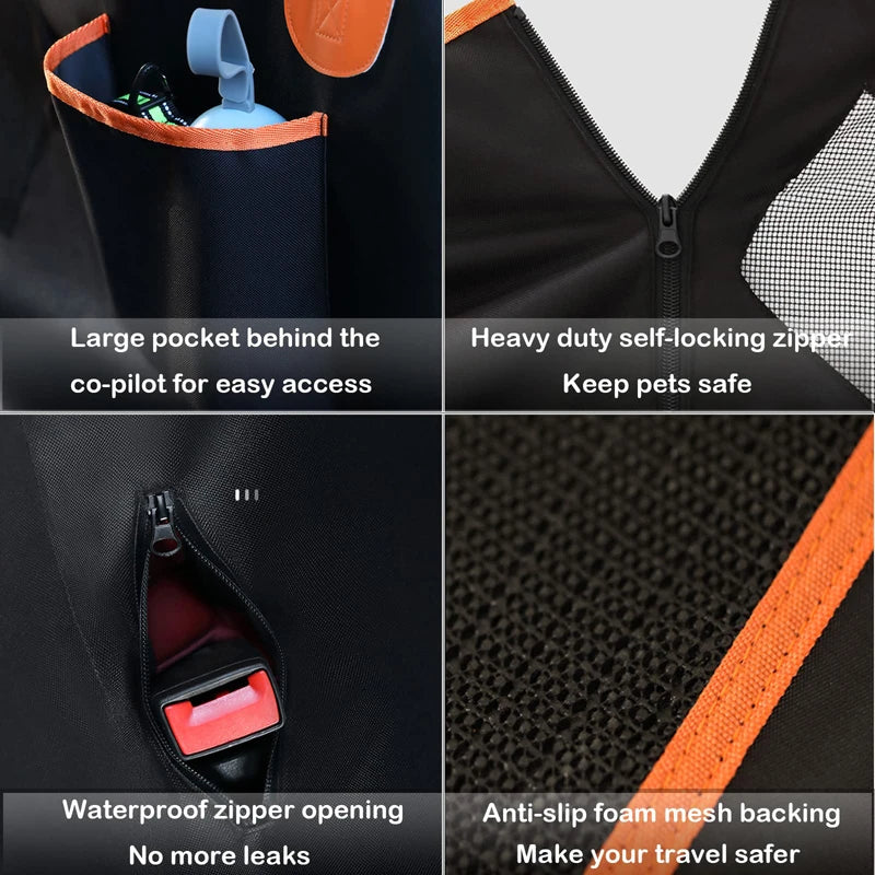 PROTECT YOUR CAR SEAT. Constructed with 4 layers of waterproof fabric, this dog backseat cover is 100% waterproof to protect your seat from mud, liquid, hair, or any mess. The one-piece cutting reduces the risk of cracked seams and avoids scratching the leather seats. Side flaps with zippers protect the door from scratches and help older dogs get in and out.