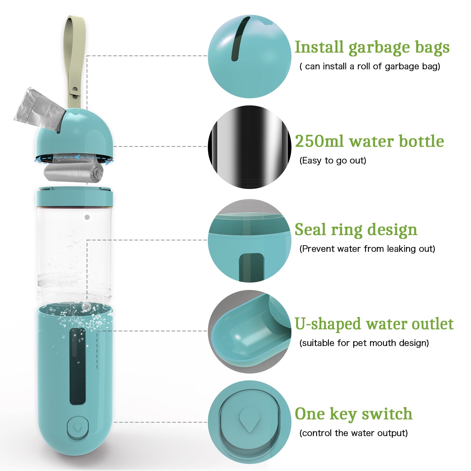 [2 in 1 Design] - This multifunctional pet water bottle can be not only a water feeder but also a pet poop bag dispenser, making pets more convenient during outdoor activities.