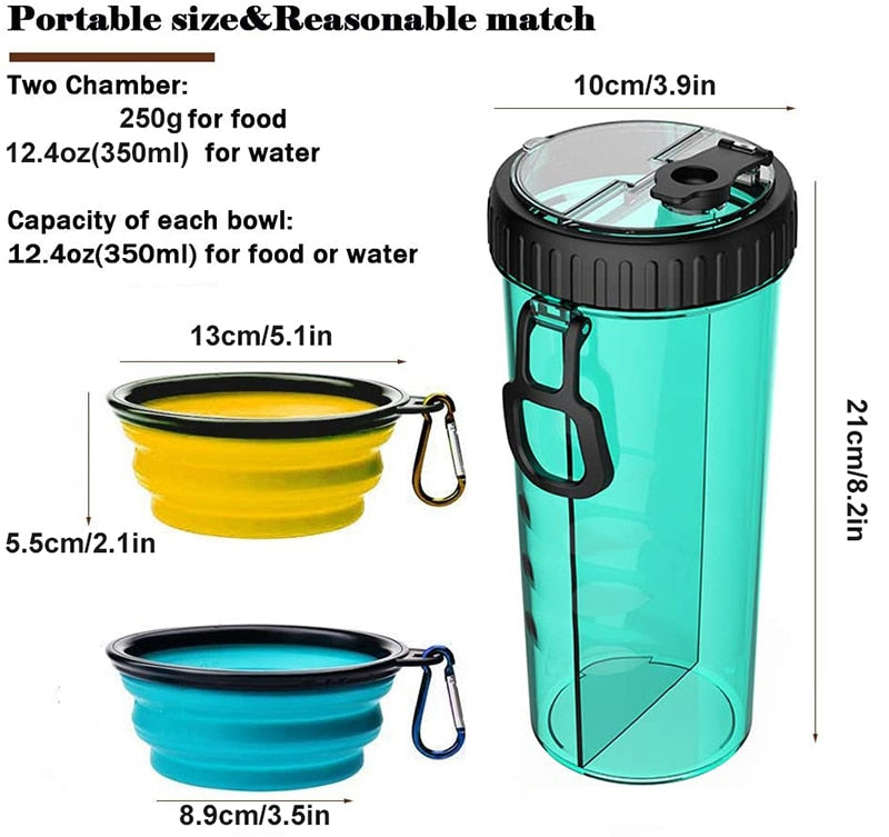 Moderate size fits in the cupholder in the car and for hanging on the backpack. The bowls clips onto the bottle for convenience. It will be the perfect partner for a day trip, hiking, running, camping, traveling and even forest adventure.