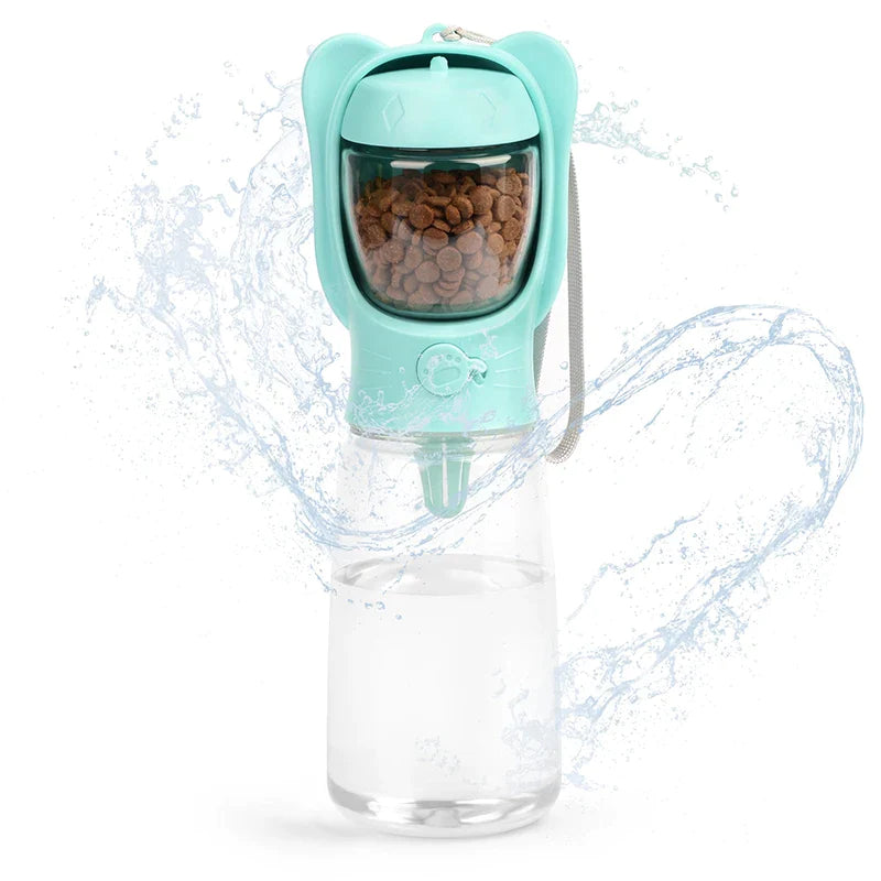 【2 in 1 Portable Design】Perfect combinations dog water bottle, comes with a food container for food/snack that fit right into the big bottle. Large Capacity of water 11.8oz (350ml) / 18.6oz (550ml) and 80g food container. Very convenient for outdoor, walks or family trips.