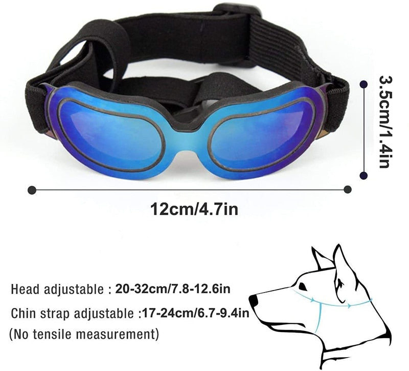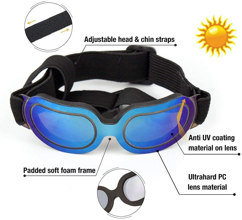 Upgraded small dog sunglasses: Sunproof coating material on super hard lens / Padded soft dog goggle frame / Specially-made dog sunglasses lens shape to fit SMALL PETS face and eyes, comfortable / Adjustable head and chin band
