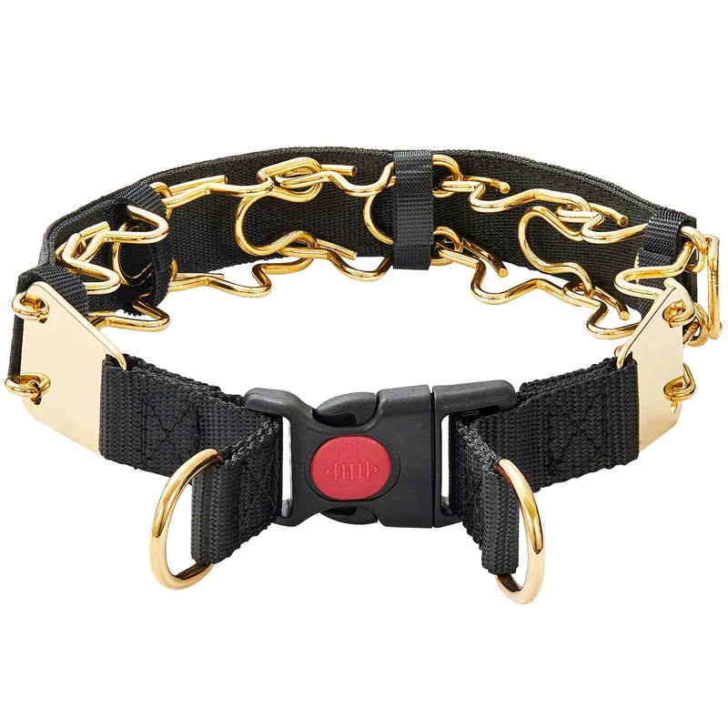 The collar, also known as a prong collar for dogs, offers necessary training pressure without the need for yelling or punishing your dog while protecting their airway and sensitive neck areas. Simply pull on the training collar, and your dog will immediately stop misbehaving.