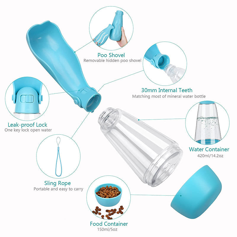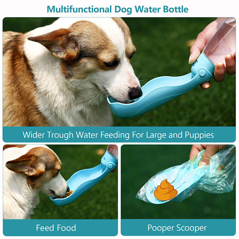 Multifunctional Dog Water Bottle:This dog water bottle has three functions, drinking water, feeding food, and shoveling poops. Meet the various needs of your pet's travel. Dogs can drink clean water and food during the trip. In addition, you can clean the pet's excrement with the attached shovel and put it in the attached convenience bag.