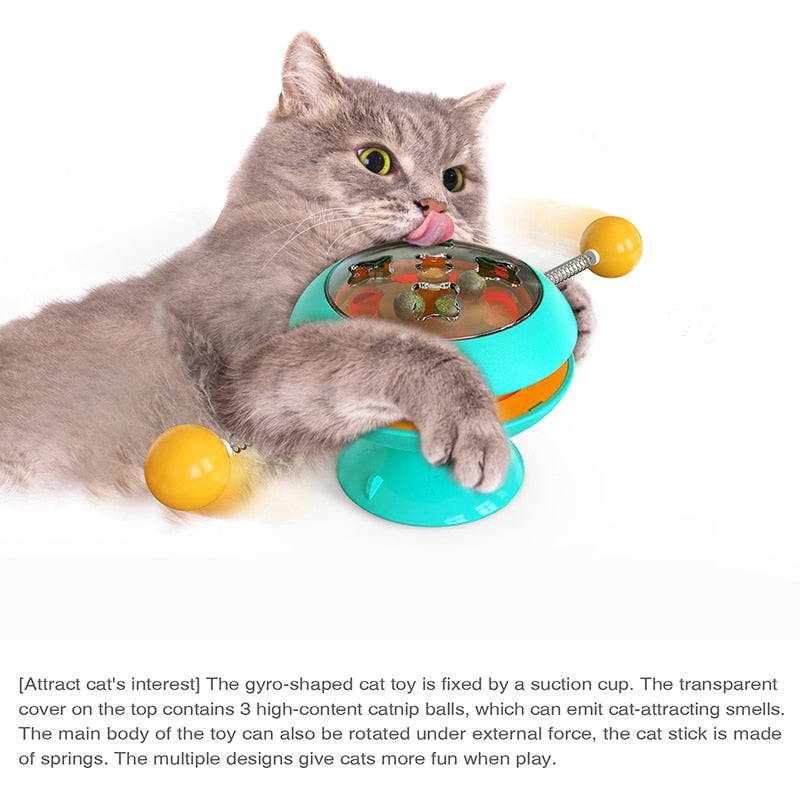 [Attract Cat's Interest] The gyro-shaped cat toy is fixed by a suction cup. The transparent cover on the top contains 3 high-content catnip balls, which can emit cat-attracting smells. The main body of the toy can also be rotated under external force, the cat stick is made of springs. The multiple designs give cats more fun when play.