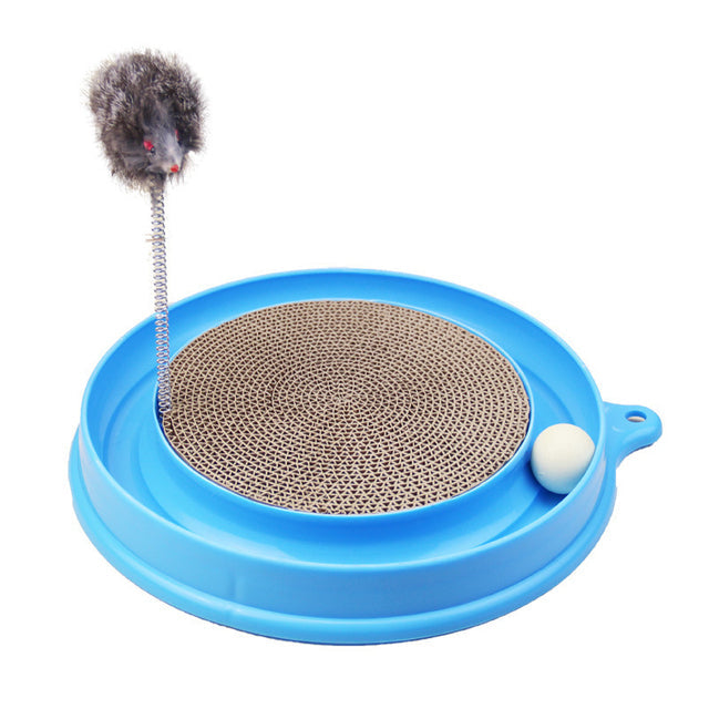 1 base (36cm/14" diameter), 1 round corrugated cardboard scratcher, and 1 ball and 1 Mouse Swatter; place ball in track for hours of fun - entertain your cat and keep away your furniture from scratching!