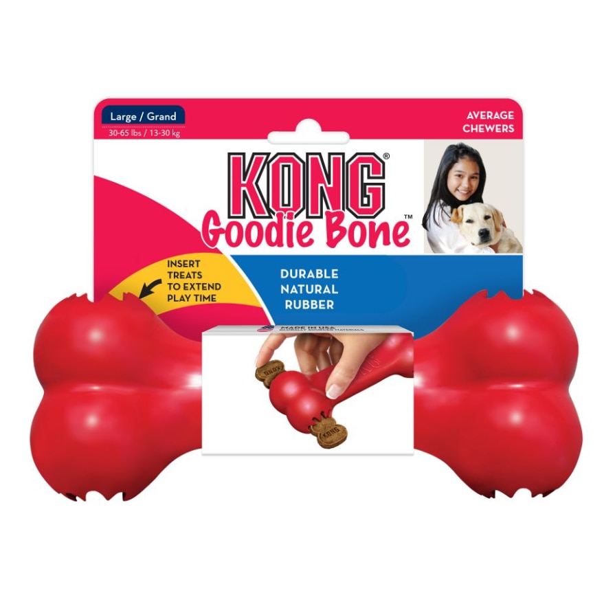The KONG Goodie Bone is the answer to dogs that love the classic bone shape, but need a safe and strong rubber toy. The ends of the Goodie Bone have our patented Goodie Grippers for stuffing with KONG Stuff'N Snacks or for filling with Easy Treat paste.