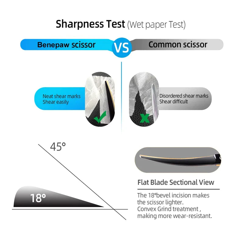 [Comfortable & smooth motion] The handle of the curved dog grooming scissors is designed to perfectly fit the hand, so the cut is more precise and the comfort is increased. The joint of the blades is professionally made, which is why the motion and the adjustment of these curved shears are very fine, with long-lasting resistance and reduced sound to motion.