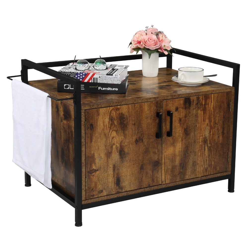 Multi-functional cat house: Use as a nightstand or side table that doubles as a pet house or litter box enclosure, iron rack handle is used to hang towels, litter scoop, grooming gloves or other cleaning supplies