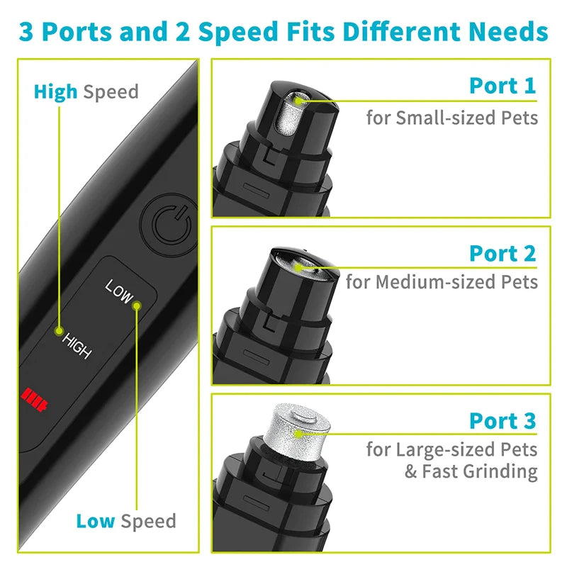 Easy to Use -- Perfect nail filer with 2 speed, low speed is quieter than high speed, which is not scared the pet. High speed is louder but it will faster. Easy to control and use with less struggling and less yelping.