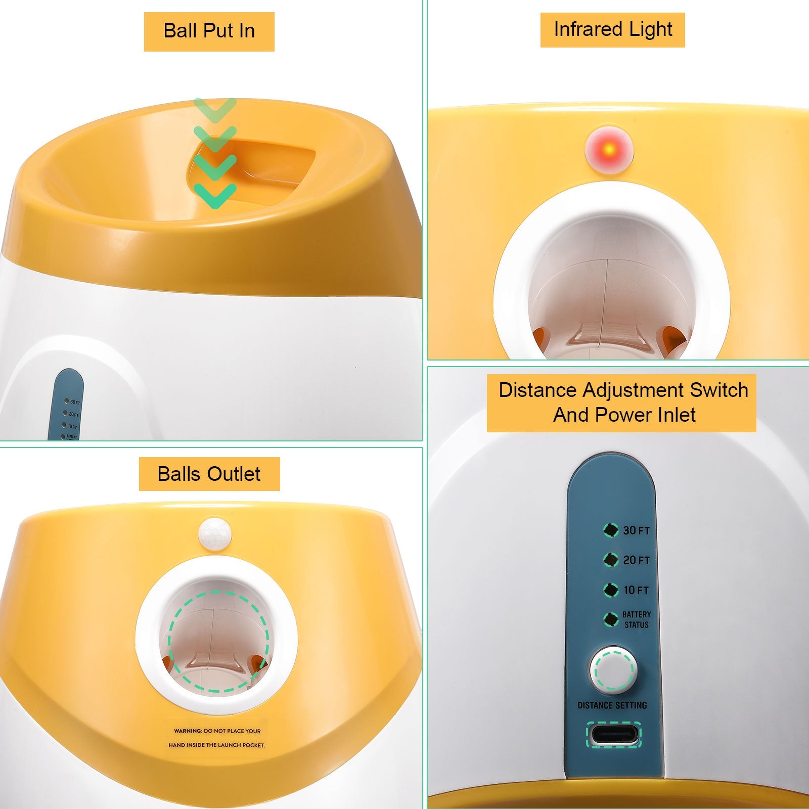 【Adjustable Launching Distance】:Automatic ball launcher has 3 different casting distance:Level 1 - Maximum distance 10ft, Level 2 - Maximum distance 20ft, Level 3 - Maximum distance 30ft (Please make sure the ball is placed in the right place before starting)
