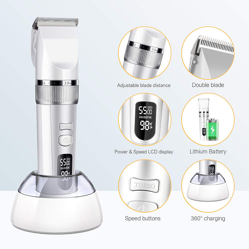 [LCD display] - LCD display prompts the battery status, charging status, speed, and lubricating oil status all time, humanized intelligent design help better trim using. With certifications of FCC/CE/PSE/RoHS, ensure the grooming clipper's professional-quality, gives a wonderful experience to your pets.
