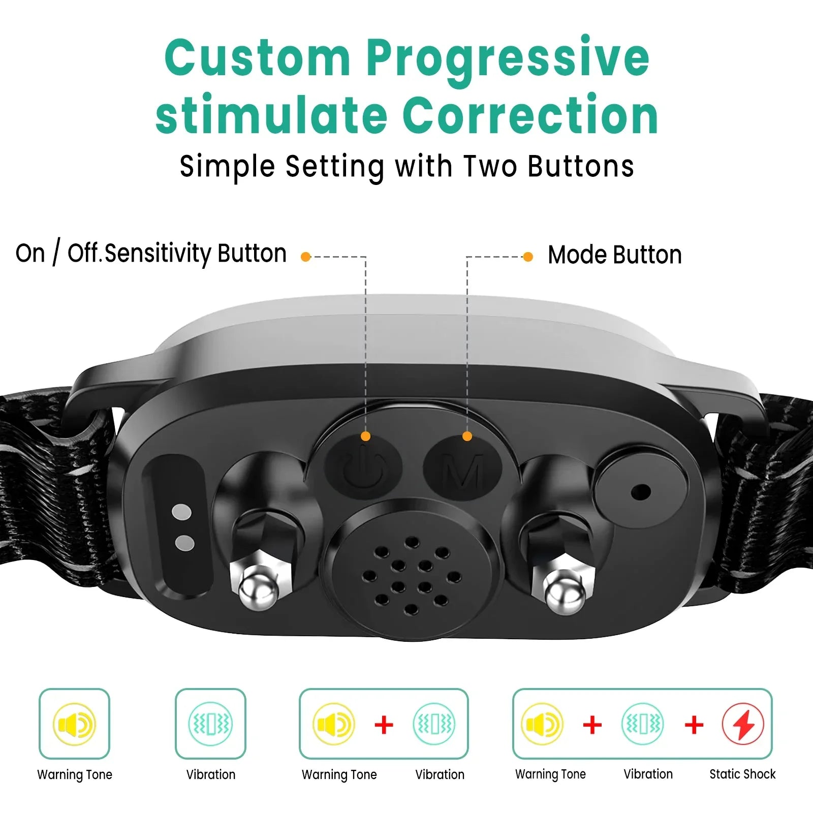 Each time a dog bark is detected, the frequency of the warning tone and the vibration level will change. For 1 time barking, Tone 1+Vibration 1; for 2 times barking, Tone 2+Vibration 1; for 3 times barking, Tone 3+Vibration 2; for 4 times barking, Tone 4+Vibration 2; for 5 times barking, Tone 5+Vibration 3; for 6 times barking, Tone 6+Vibration 3. It will remains in “for 6 times barking”intensity if your dog keeps barking. Back to “for 1 time barking”intensity if the device not activated for 1 minute.
