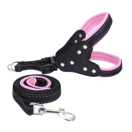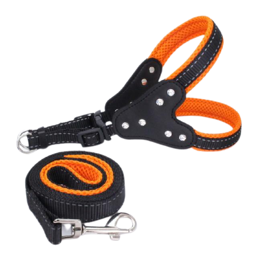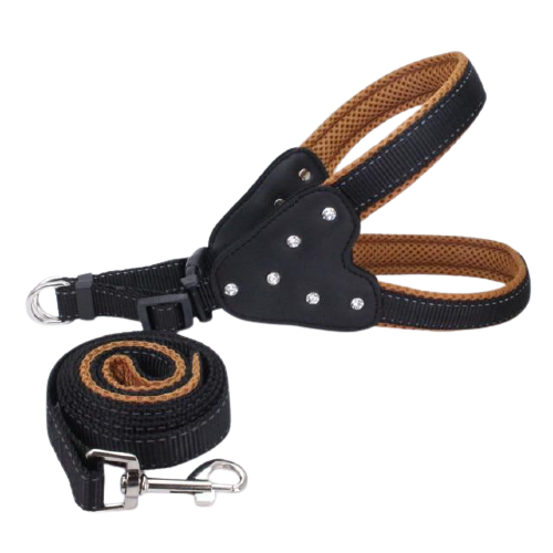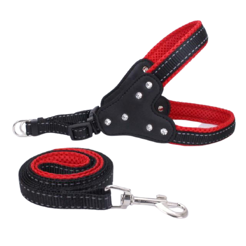 Rhinestone decorative mesh chest strap set, nylon mesh cloth inside, soft texture, comfortable and breathable, pet wearing comfort; chest strap with high quality nylon mesh cloth and nylon webbing line, nylon webbing and mesh fabric 2 layers guarantee.