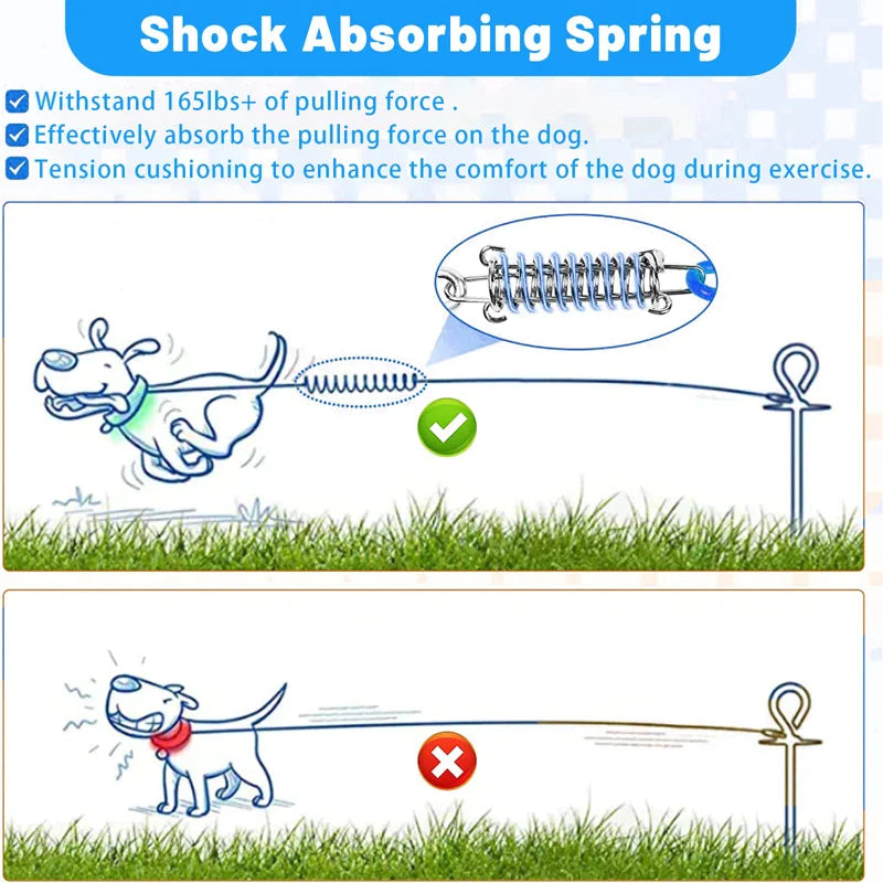 BUFFER SPRING: A buffer spring is installed at one end of the cable, which can cushion the pulling force of the dog when it runs fast, reduce the damage to the dog's neck and body, and provide a more comfortable playing environment for the dog.