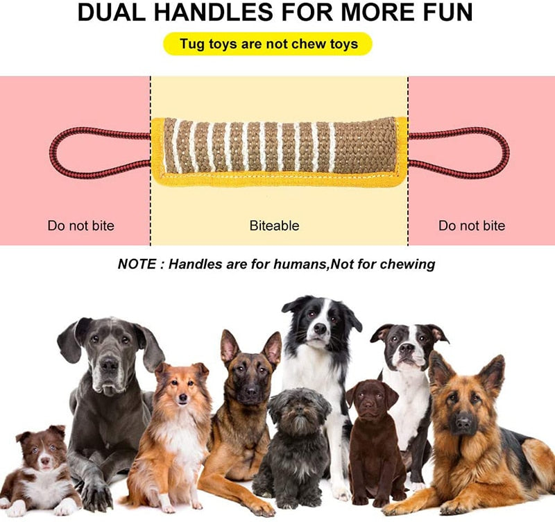 EXTRA DURABLE & SAFE: Our dog tug toy with double stitching is made of the highest quality jute material to ensure that your dog will never tear it when having fun. The biting surface is super tough yet soft for canine's teeth, to keep both of you absolutely safe.