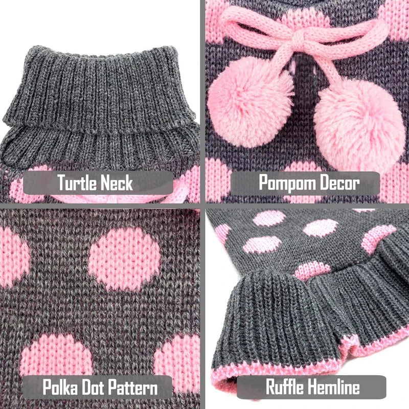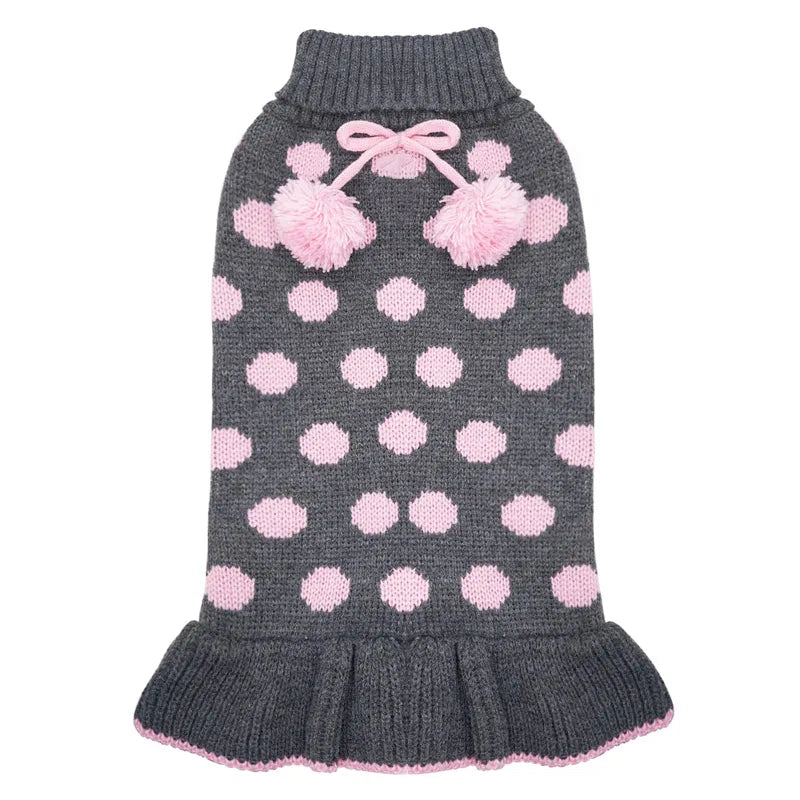 Dog sweater dress with cute pom ball on the back, cute ruffle dress design great for a girl dog sweater.