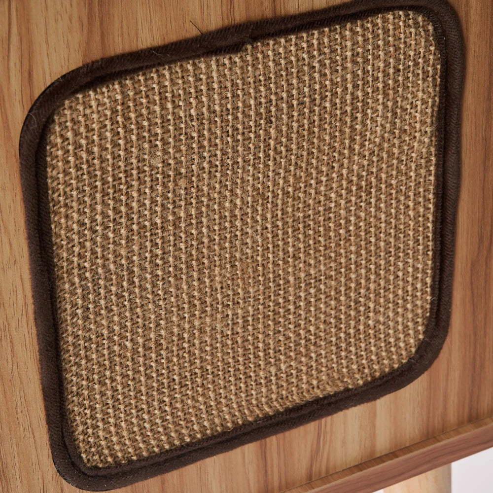It comes complete with a jute fabric scratching pad that helps in keeping your cat's claws trimmed and healthy and a soft, plush, removable and washable mat that is comfortable for your cat and will make the cleaning process easier for you.